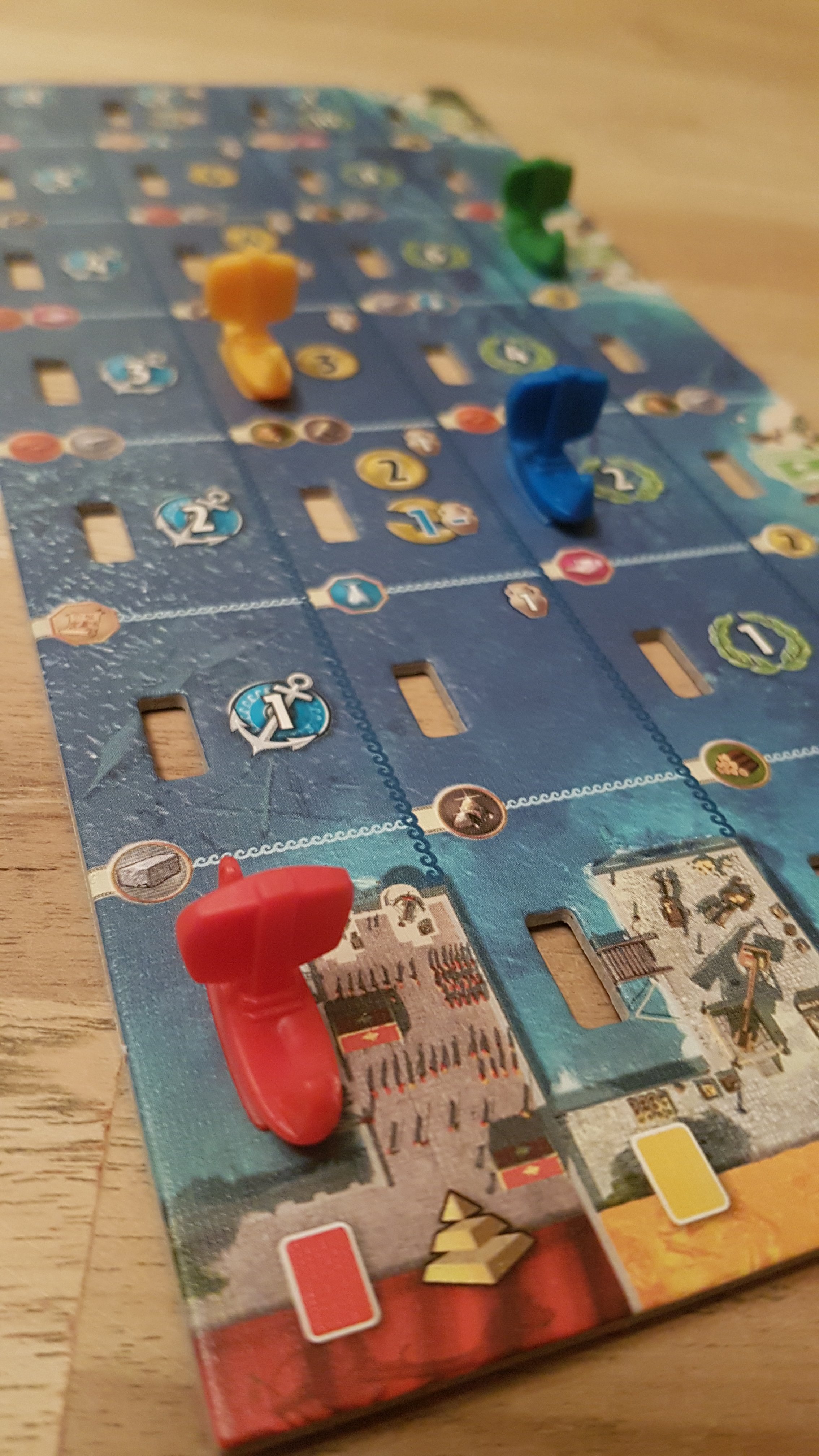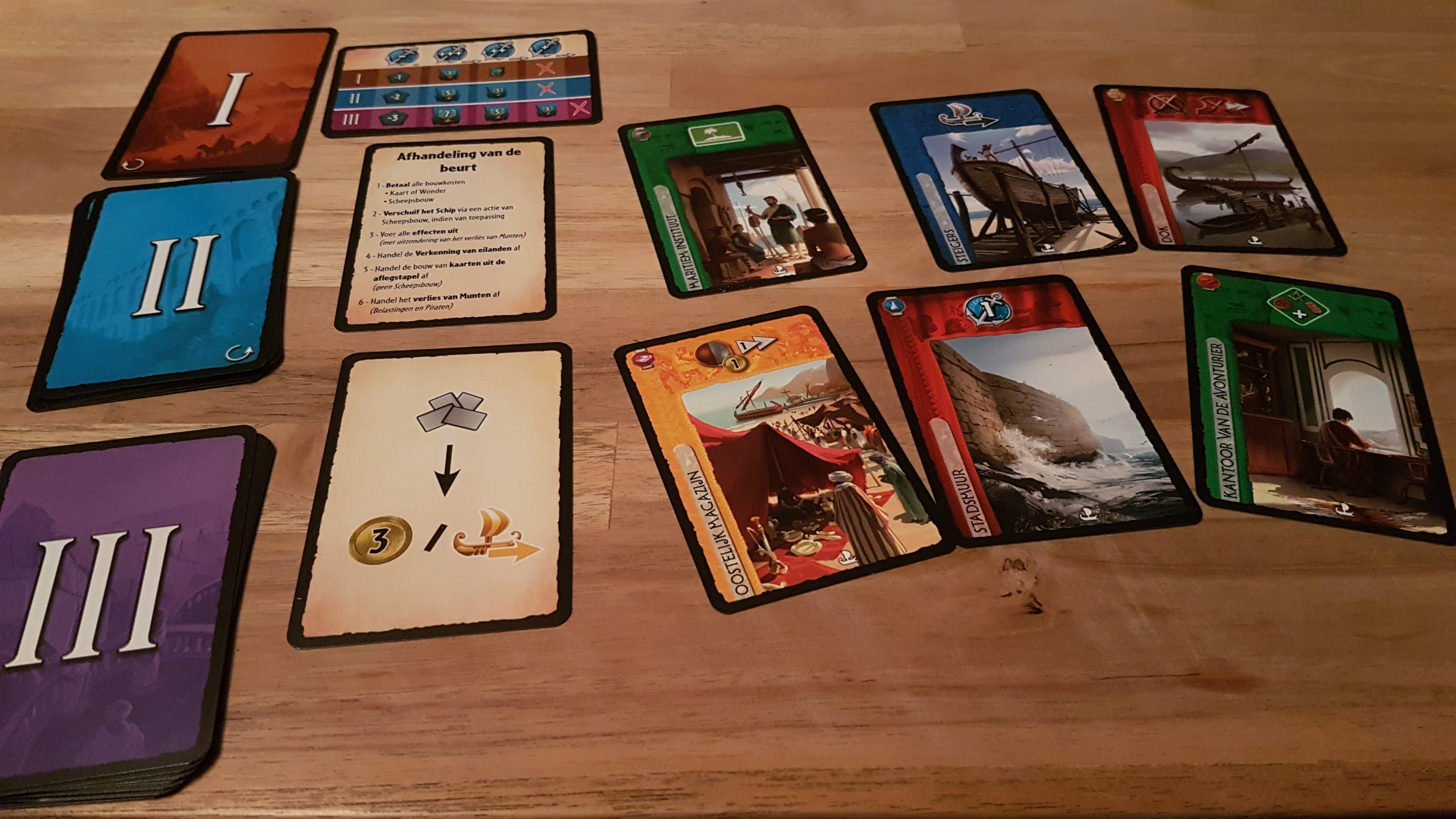 Laten we even in detail bekijken hoe deze uitbreiding het basisspel verandert. Het extra Scheepswerfbord wordt naast het Wonderbord geplaatst. Elke vloot start onderaan de track in de overeenkomstige kleur. Telkens een speler een rode, gele, groene of blauwe kaart bouwt, mag hij/zij daarna aan scheepsbouw doen door de vloot van dezelfde kleur als de zojuist gebouwde kaart op te waarderen. Daarvoor moet hij/zij naast de kostprijs van de kaart ook de kosten betalen voor de scheepsbouw van de overeenkomstige kleur op de scheepswerf. Daarna mag het schip van dezelfde kleur 1 vak naar boven op de scheepswerf verschoven worden.