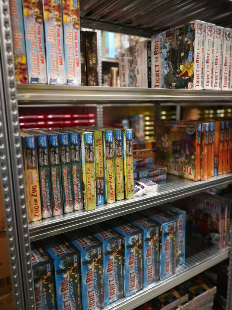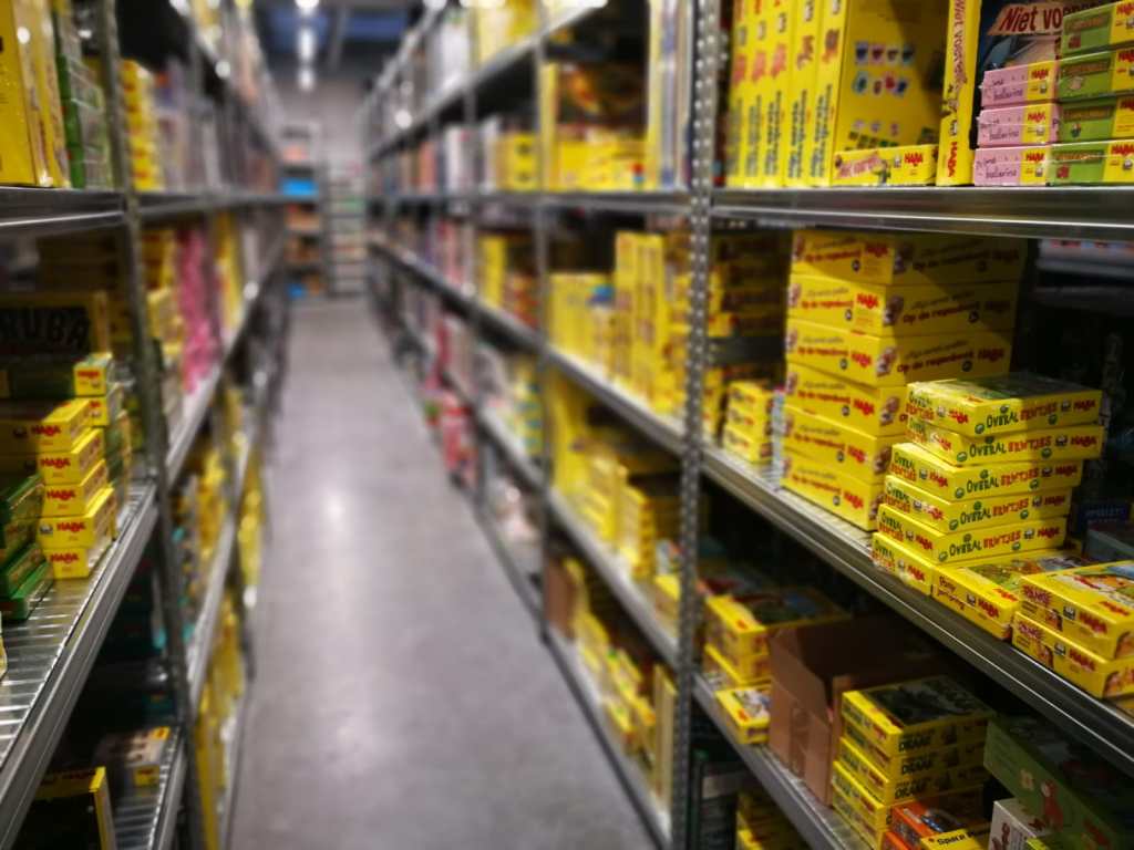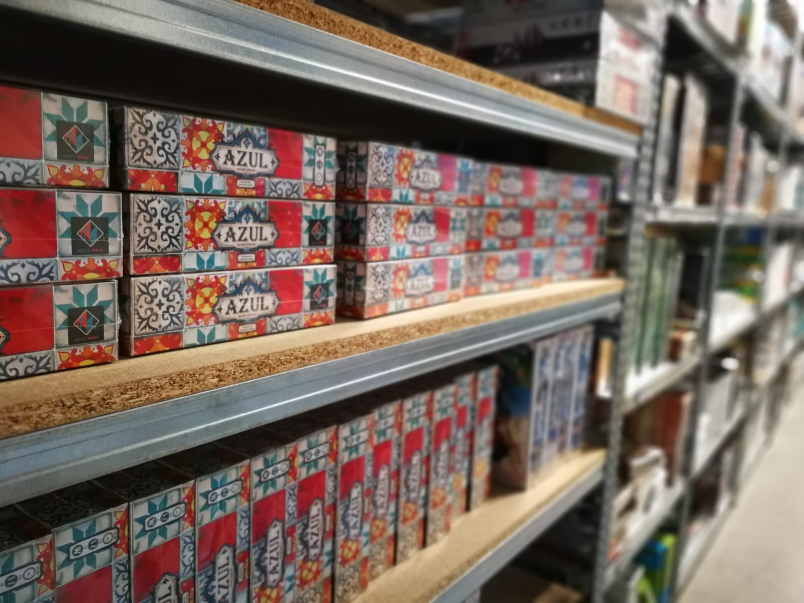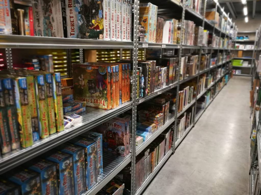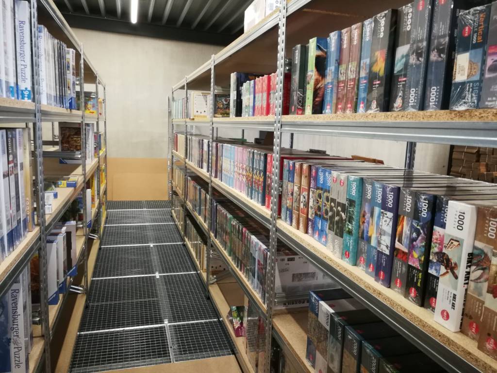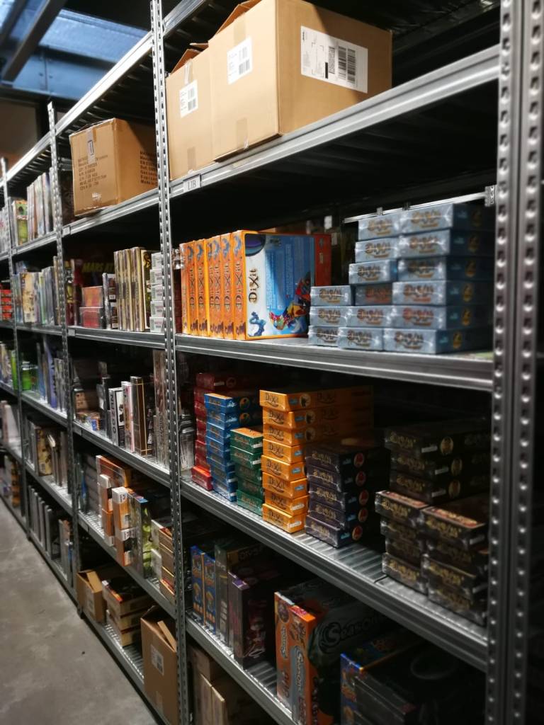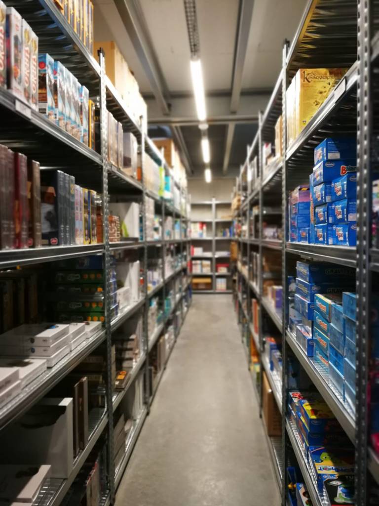 De oppervlakte van het magazijn is 360 m². Momenteel hebben we er ruim 12.000 spellen in