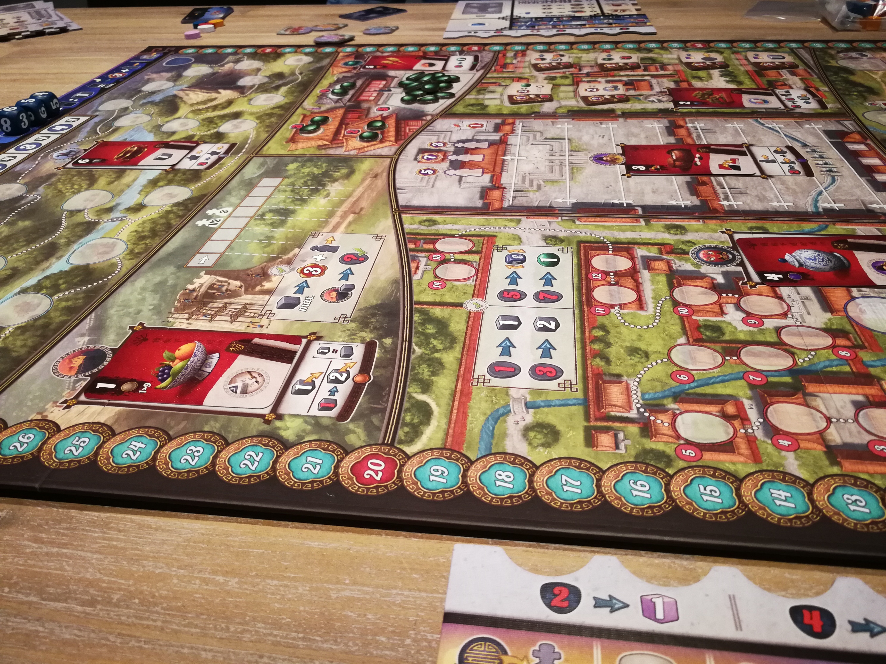 Gùgōng zit thematisch zeer sterk in elkaar: het ademt het oude China uit. Het spelbord en de onderdelen zijn van uitstekende kwaliteit en je merkt het oog voor detail dat de makers hebben, doordat er voor zowat elke locatie aparte custom markers voorzien werden. De Deluxe editie – die binnenkort terug via Kickstarter beschikbaar zal zijn – heeft nog betere kwaliteitscomponenten.