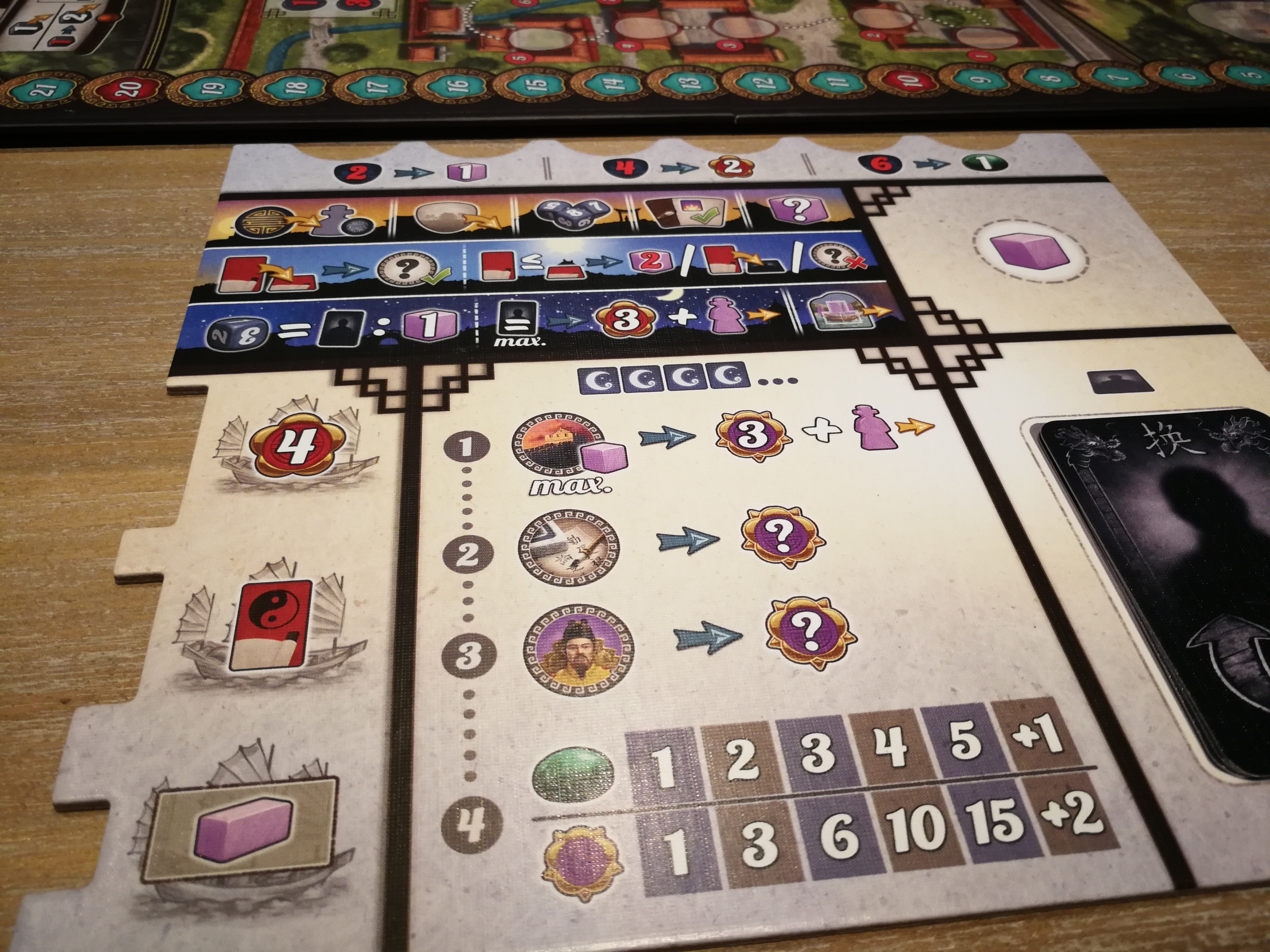 - Decreten; deze leveren je onmiddellijk punten en voordelen op lange termijn op (bvb goedkoper jade kopen, handkaarten wisselen tijdens de nachtfase, punten op het eind van het spel, …)