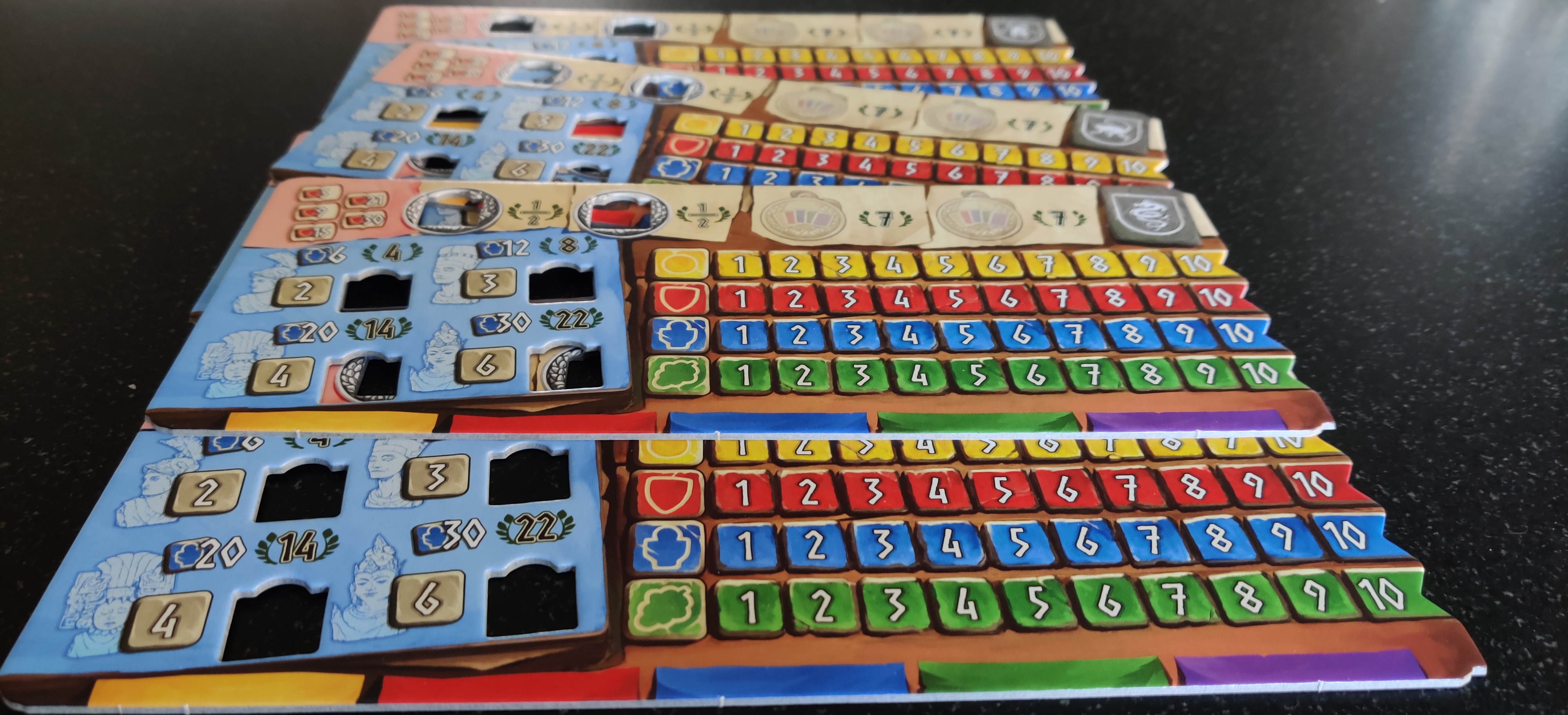 Voor elke speler is een tijdperkenoverzicht, 4 markeerstenen, 8 bonusfiches, 2 gouden zegels, een startkaart en een persoonlijk spelbord voorzien. Dat persoonlijk bord bestaat uit verschillende secties: