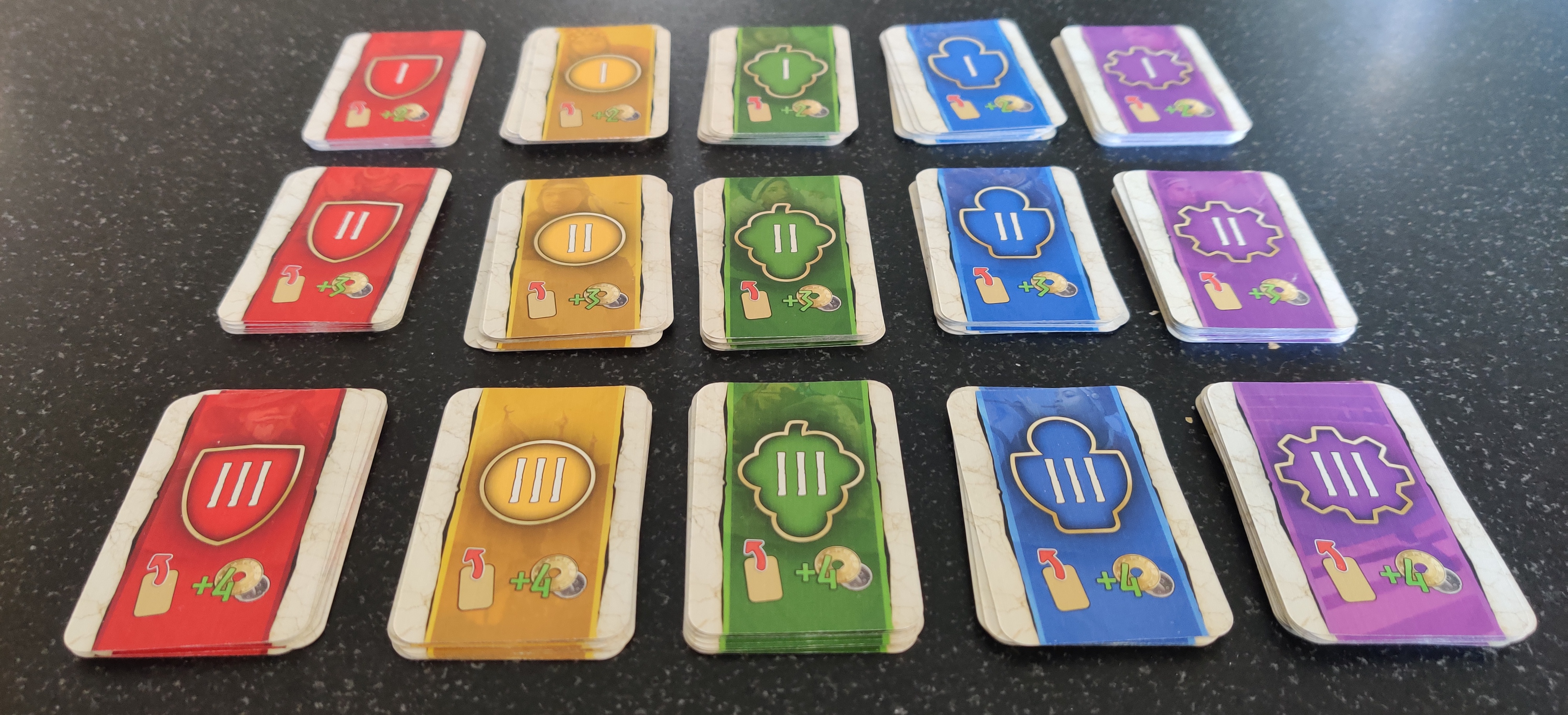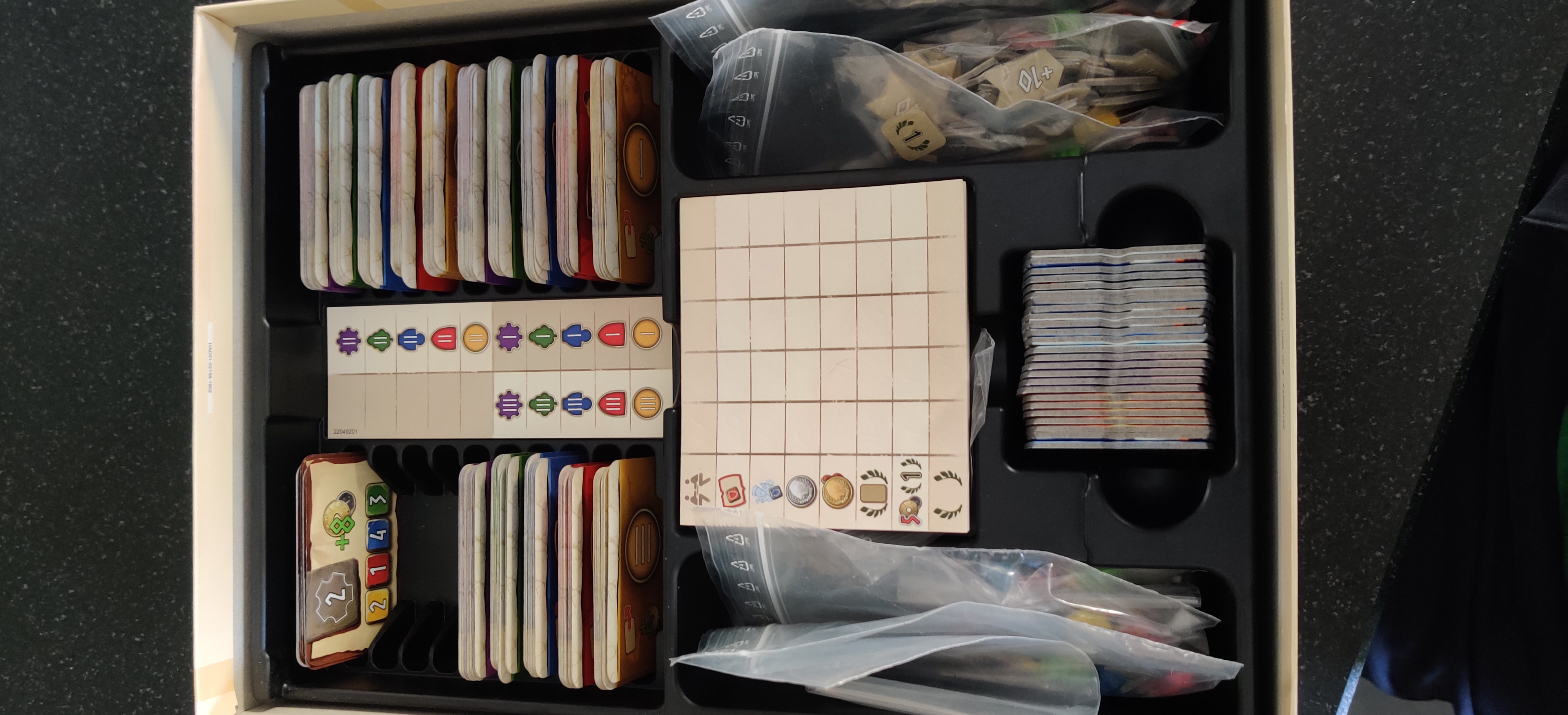 Daarnaast zitten er heel wat tijdperkkaarten in de doos, maar liefst 162, in dezelfde 5 kleuren als het spelbord en opgedeeld in 3 tijdperken. In de doos zijn uitsparingen voorzien om alle kaarten netjes gesorteerd op te bergen. Altijd leuk als hier aandacht aan wordt besteed!