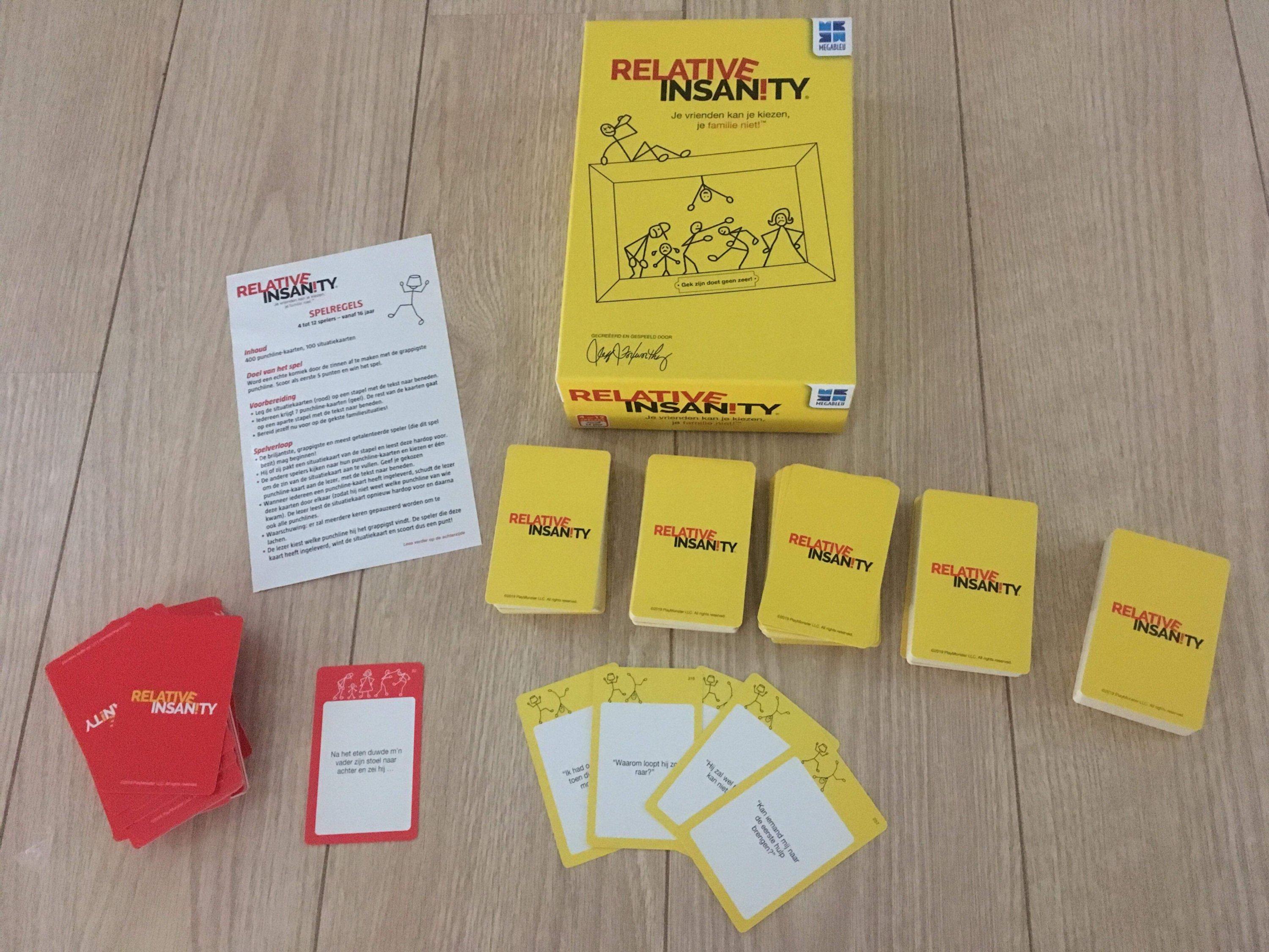 Relative insanity is een party kaartspel dat werkt met de beproefde formule van de situatiekaarten en punchlinekaarten. Het spel bevat 400 punchlinekaarten en 100 situatiekaarten. Ruim voldoende om talloze keren te spelen met maximum 12 spelers vanaf 16 jaar.