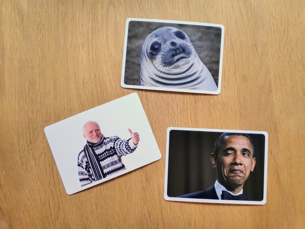 Wie bekend is met party games zoals Cards Against Humanity, zal zich snel thuis voelen in What Do You Meme? Het concept tussen beide spellen is dan ook volledig gelijklopend en uiterst eenvoudig. Voor we in de technische details duiken, zou ik een misvatting uit de wereld willen helpen met name dat het woord “meme” uitgesproken zou worden als “mémé”. De correcte uitspraak (in pseudo-fonetisch schrift) is “miem” en klinkt ons alleszins niet in de oren als een koosnaampje voor je oma.