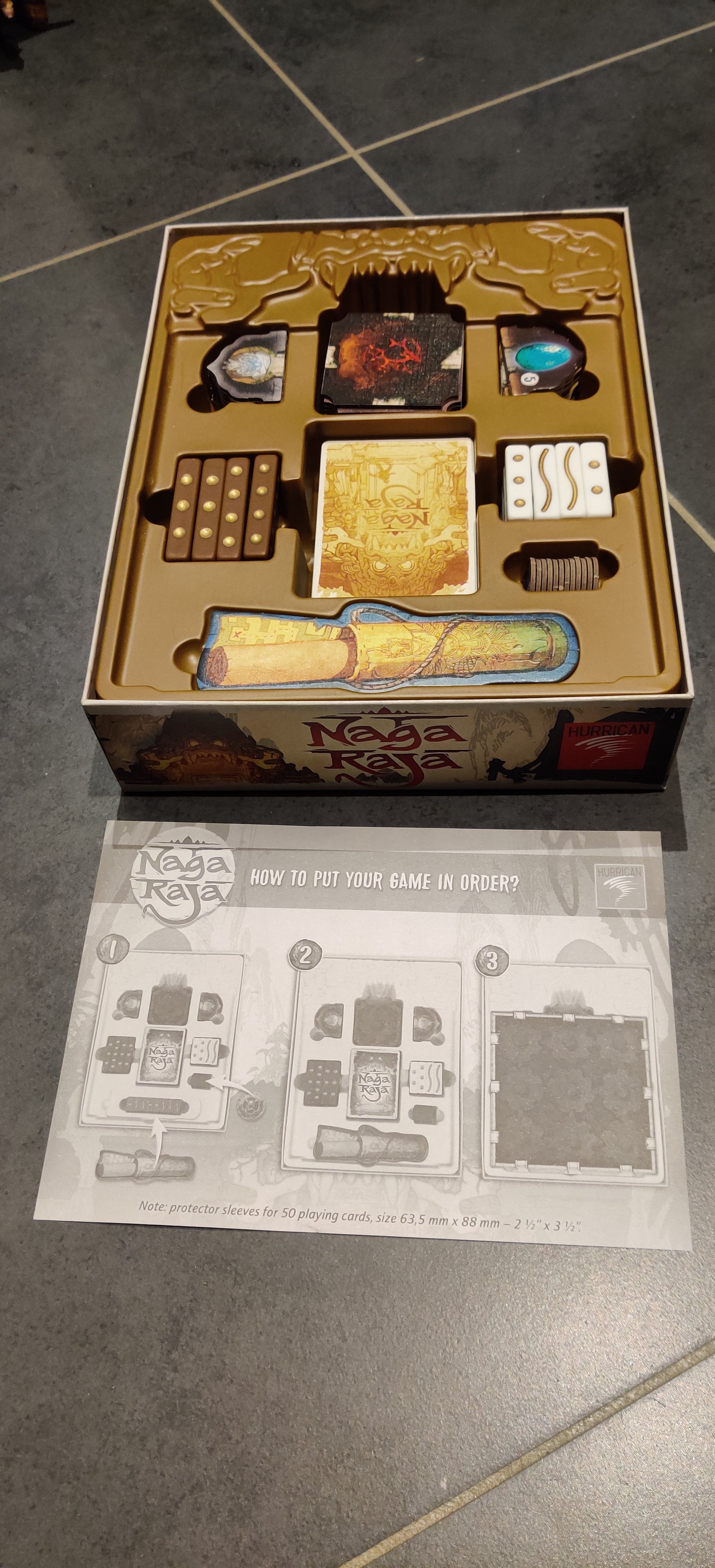 Naga Raja bevat verschillende soorten spelmaterialen: persoonlijke spelersborden, relikwieën, kaarten, artefacten en mysterieuze dobbelstaafjes. Zeer mooi thematisch vormgegeven en perfect op te bergen in de speldoos via speciaal voorziene meerlagige uitsparingen. Altijd leuk als hierover wordt nagedacht. Maar bij Hurrican gaan ze zo ver om zelfs opberginstructies toe te voegen. Daarmee scoren ze ontegensprekelijk pluspunten!