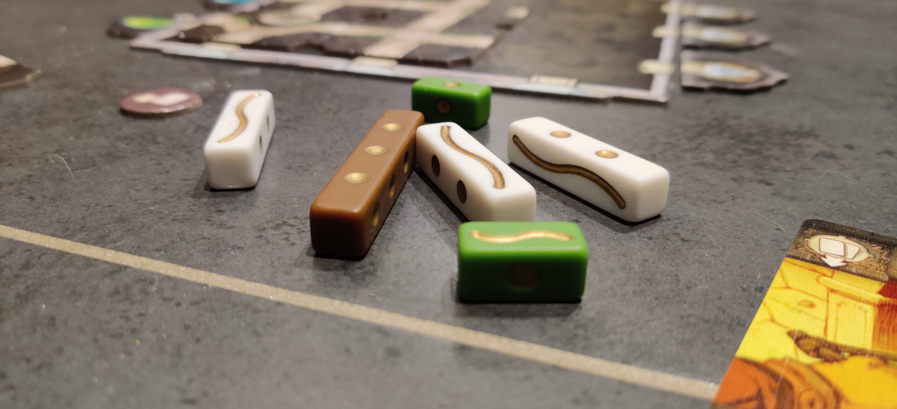 Op sommige tegels ligt een artefact dat een specifiek voordeel oplevert: extra punten, … TODO. Het zal je niet verbazen dat alle middelen ingezet worden om tegels met artefacten te bemachtigen. Die middelen worden beschikbaar gesteld onder de vorm van naga’s op de dobbelstaafjes. Er zijn 3 soorten staafjes: bruine, witte en groene. De bruine kunnen enkel naga’s opleveren. Op de witte staan zowel naga’s als raja’s. De groene staafjes bevatten voornamelijk raja’s.