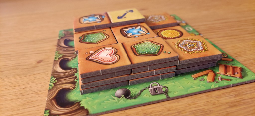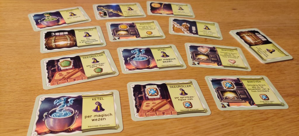 Tot slot zijn er ook nog beloningskaarten die de speler verdient voor elke laag die hij/zij in zijn/haar beurt heeft afgebouwd. De beloningen en de voorwaarden zijn zeer divers. Je kan extra punten scoren per sprookjesfiguur met een bepaald soort peperkoek, per magisch sprookjesfiguur dat je gevangen genomen hebt, indien je huis uit een bepaald aantal lagen bestaat enz… Dit geeft een leuke taktische twist aan het spel vanwege de dubbellagigheid die het toevoegt.
