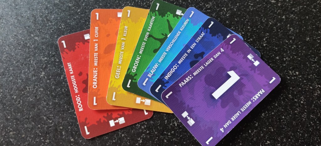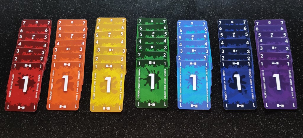 Het spel bestaat uit 49 kaarten, onderverdeeld in de 7 kleuren van de regenboog: rood, oranje, geel, groen, blauw, indigo en violet. Van elke kleur zijn er 7 kaarten met waarde 1 tot en met 7.