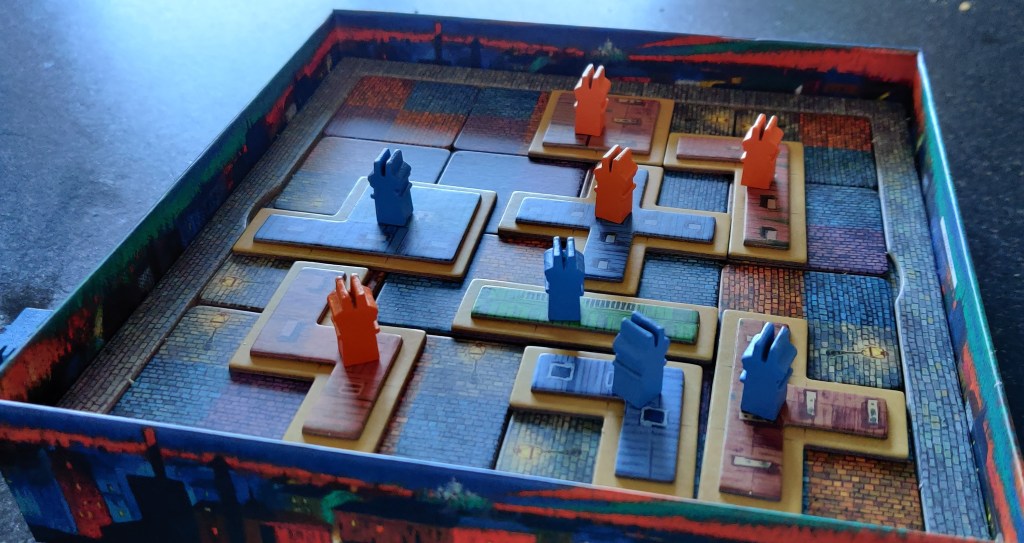 Er zijn 16 vierkante keientegels voorradig, 8 per speler, met op de achterzijde de spelerskleur blauw of oranje. Elke tegel is opgedeeld in 4 velden. Op zo’n veld kan de kleur van de tegel staan, de kleur van tegenspeler, een mix van beide spelerskleuren of een straatlantaarn.