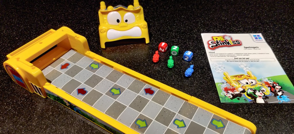 De Stinkies is een race tegen de klok spel voor jonge kinderen. Het ziet er kleurrijk uit, heeft een leuk thema en is mooi vormgegeven waardoor het kinderen meteen aanspreekt. Het feit dat er dynamische elementen aanwezig zijn – de loopband die automatisch beweegt – maakt het extra aantrekkelijk. Robbe heeft er al heel wat plezier aan beleefd. Het spel is wel specifiek op kleine kinderen gericht. Mama en papa kunnen wel meespelen maar idealiter zou hij het met zijn broer moeten kunnen spelen die met zijn 2 jaar nu nog wat te jong is 🙂