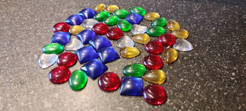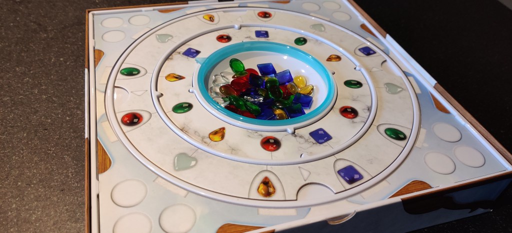 Wauw! Dat moet zowat het eerste zijn dat in me op kwam toen ik de doos en het materiaal van Murano zag. Heel strak gedesignde doos. Gedurfd ook met die witte achtergrond. Leuk mechanisme met die draaischijf in de doos, die bovendien als spelbord fungeert. Leuke edelstenen ook… Maar, speelt het ook zo leuk als het er uit ziet?