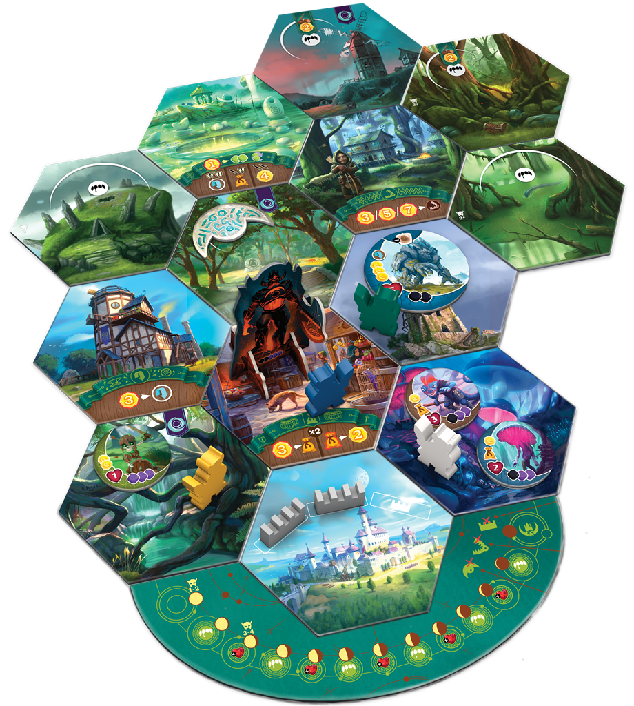 Afhankelijk van het aantal spelers ziet het spelbord er een klein beetje anders uit, maar de basis is altijd hetzelfde: onderaan heb je het maanspoor met daarin het kasteel, de 3 bordtegels daarboven liggen ook vast. Alle andere bordtegels worden geschud en willekeurig geplaatst met de achterzijde naar boven. In de loop van het spel zal je deze pas gaan ontdekken en omdraaien.