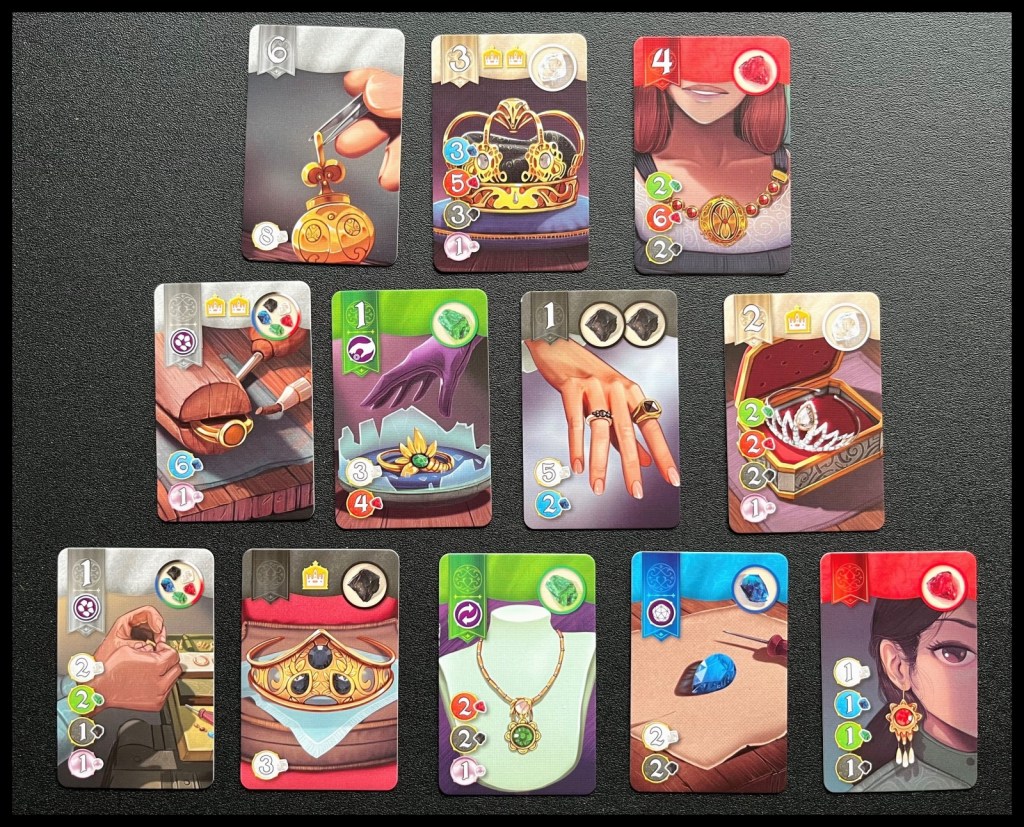 Tijdens de voorbereiding worden er een ander aantal kaarten op tafel gelegd, afhankelijk van het niveau: 5 van niveau 1, 4 van niveau 2 en 3 van niveau 3. De kaarten leveren niet enkel prestigepunten en edelstenen op, ze bevatten ook specifieke eigenschappen en sommige leveren ook kronen op.