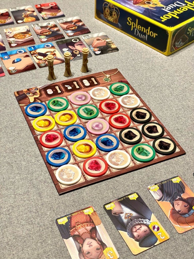 In essentie draait het nog steeds om engine-building-gewijs juweelkaarten te verzamelen. Je start noodgedwongen met edelsteenfiches en gaat gaandeweg meer en meer edelstenen bezitten via de juweelkaarten. Daardoor verwerf je steeds makkelijker en sneller nieuwe juweelkaarten. Maar laat ons nu vooral focussen op wat Splendor Duel zo anders maakt.